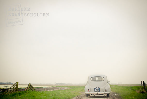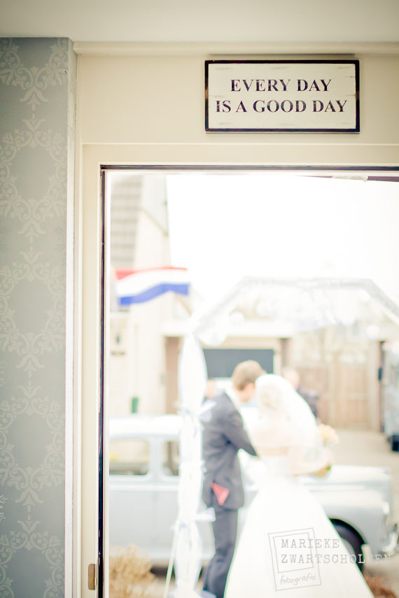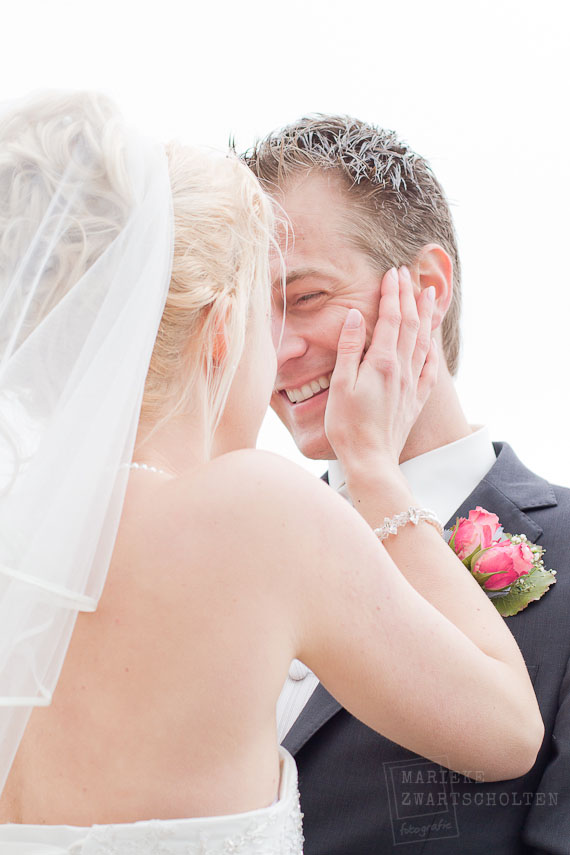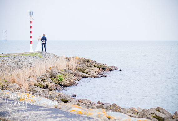 Dat zette de toon van de dag. Want natuurlijk trok Manon haar prachtige bruidsjurk aan, maar haar humor ging niet meer weg. Zo klaagde ze geen seconde over eventuele kou tijdens de wandeling langs het IJsselmeer of onze stop bij een schattig stationnetje en was haar vrolijke lach van ver te horen. Heel aanstekelijk.