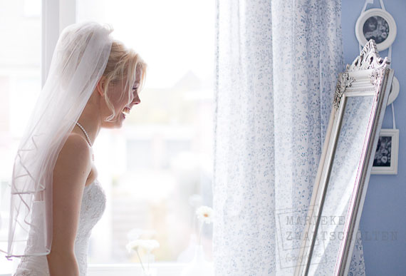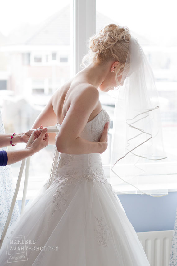 De dag begon met foto’s nemen tijdens het aankleden. Altijd een mooi moment: de bruid die geholpen wordt door haar moeder en de ceremoniemeester. Ik kwam boven, waar de bruid in haar lingerie me opwachtte: “Zo, ik ben klaar!”.